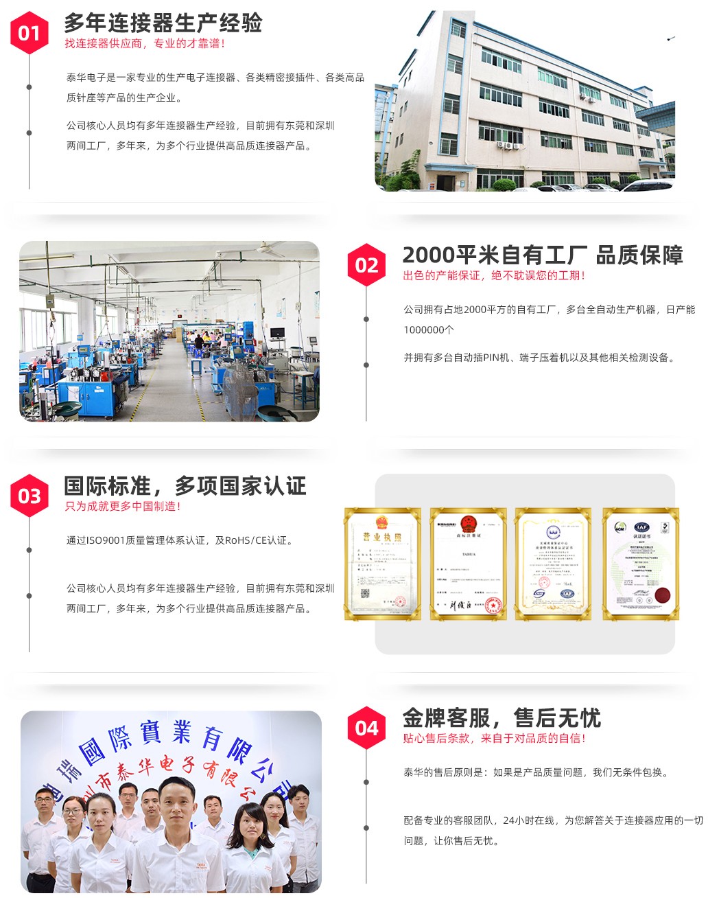 深圳市泰華電子有限公司15年專注連接器,多來(lái)成功為全國(guó)2000家大中小型企業(yè)提供專業(yè)的技術(shù)和服務(wù)。本公司具備先進(jìn)的生產(chǎn)設(shè)備,標(biāo)準(zhǔn)化生產(chǎn)流程接插件日產(chǎn)100萬(wàn)。所有產(chǎn)品通過(guò)ISO9001、ROHS等認(rèn)證,自成立以來(lái)一直秉承品質(zhì)為先,客戶至上的理念。